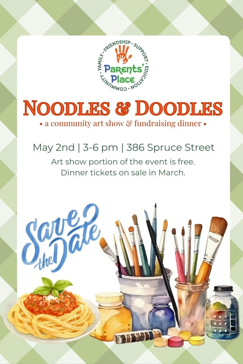 Noodles & Doodles is both a free art contest for students, and a spaghetti dinner fundraiser to benefit Parents’ Place. Families of artists are welcome to view all of the submitted artwork in a gallery-like setting on May 2, 2026 from 3-6pm at Parents’ Place, located at 386 Spruce Street.